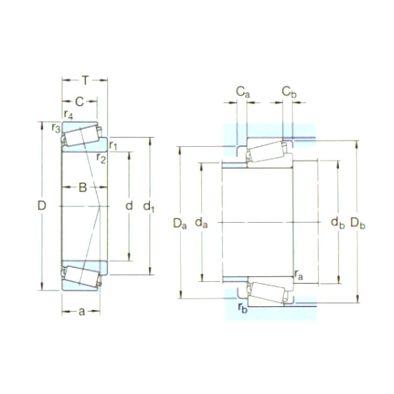 | D1 | D | B | DYC (CR) | STC (Cor) | Rátálacha luais | Luas teorannaithe | Toisí (ABMA) | d | D1 ~ | B | C | R1,2 (min) | R3,4 (min) | a | da (max) | DB (Min) | Da (min) | Da (max) | DB (Min) | CA (min) | SL (min) | ra (max) | RB (Max) | e | Y | Yo | |||